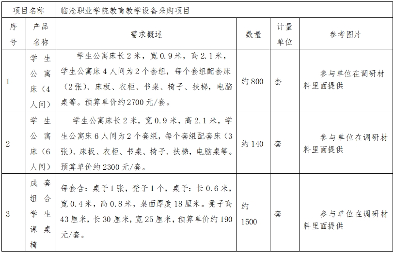 根据《中华人民共和国政府采购法》、《政府采购需求管理办法》等有关规定,伟德国际英国拟对新采购学生公寓床、课桌椅等物资发布采购前期市场调研征集公告,欢迎具备资质、有意向的单位参与,并提供市场调研材料。