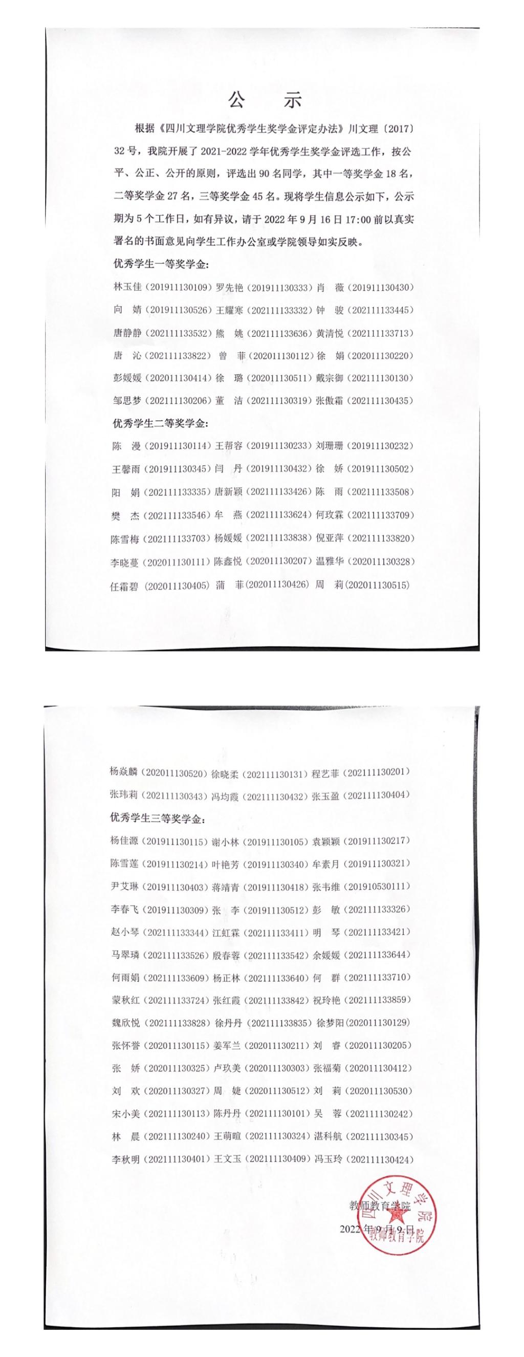 金年会官网2021-2022学年度优秀学生奖学金公示通知