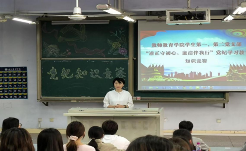 为深入学习贯彻《中国共产党纪律处分条例》,教育引导广大党员同志自觉主动学纪、知纪、明纪、守纪,全面落实从严治党要求,努力把纪律规矩转化为政治自觉、思想自觉、行动自觉,2024年6月5日,金年会官网学生第一、第二党支部在博文楼215教室开展“清正守初心、廉洁伴我行”党纪学习教育知识竞赛活动。本次活动采取集中线上答题形式,学生第一、第二党支部全体党员参加。党委副书记王文娟主持本次活动。