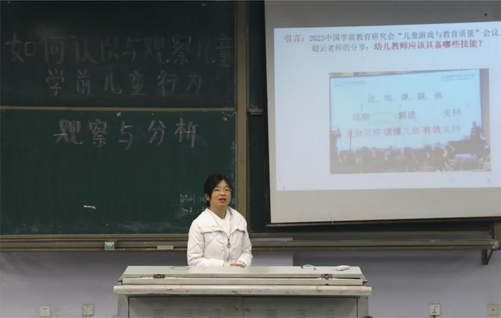 为进一步提升金年会学前教育专业学生师范技能,2023年11月21日16:20,我院在博文楼111教室开展“如何认识与观察儿童——学前儿童行为观察与分析”专题讲座。2021级5班、6班全体同学参加本次讲座,学前教育专业教研室主任王冬梅老师主讲。