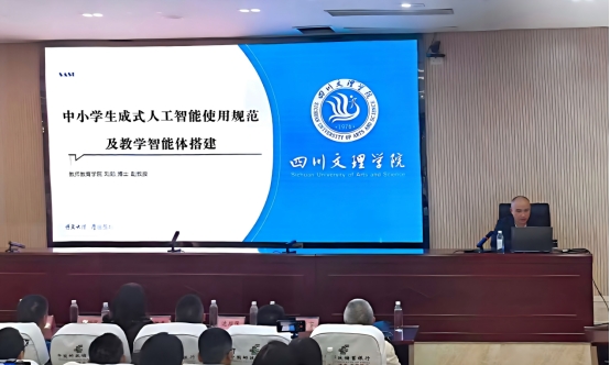 为深化人工智能在中小学教育教学中的融合应用,提升教师数字素养与教学创新能力,2025年9月28日,达州市电化教育与技术装备中心在万源第三中学举办中小学人工智能应用专题培训,全市300余名智慧教育“种子教师”参会。金年会小学教育专业教研室主任刘勉博士受邀以专家身份出席,并作“中小学生成式人工智能使用规范及教学智能体搭建”主题演讲。